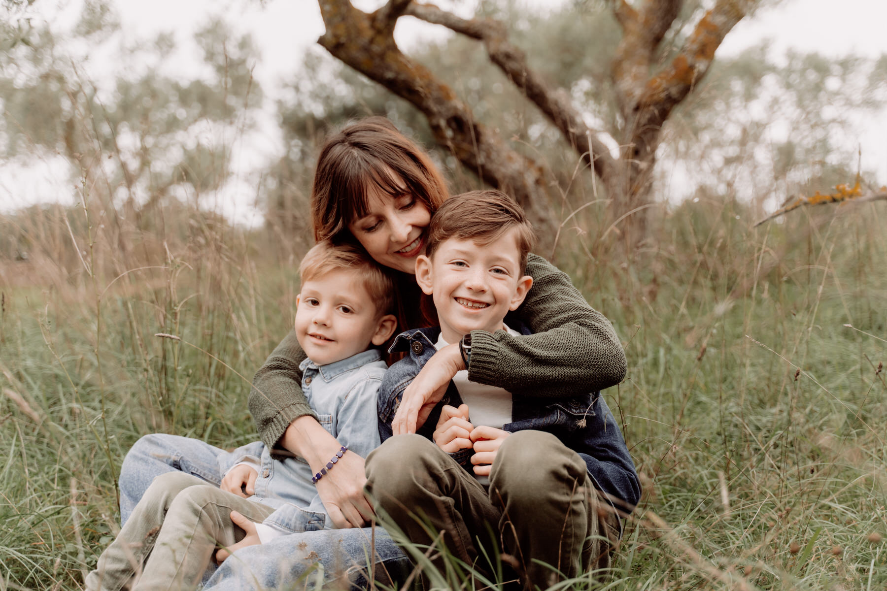 Une maman et ses deux fils assis dans l'herbe. Leurs tenues est en accord avec la nature et le confort. Ils rigolent